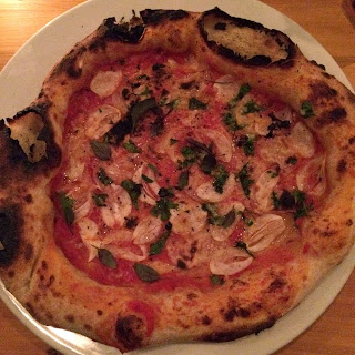 O cardápio é super conciso. Deve ter uns 5, 6 sabores no máximo. Todas rossas (com molho de tomate, que, aliás, é feito na casa e ótimo). Pedi a Marinara (molho de tomate, manjericão e alho fatiado), enquanto HK pediu a com radicchio, pancetta, raspas de laranja e molho de tomate (ambas R$25). A de radicchio, antes que me perguntem, não fica amarga! Foi meu recheio favorito. Apesar de amar alho, achei que estava muito picante. Deveriam dar uma pré-assada/ fritada.